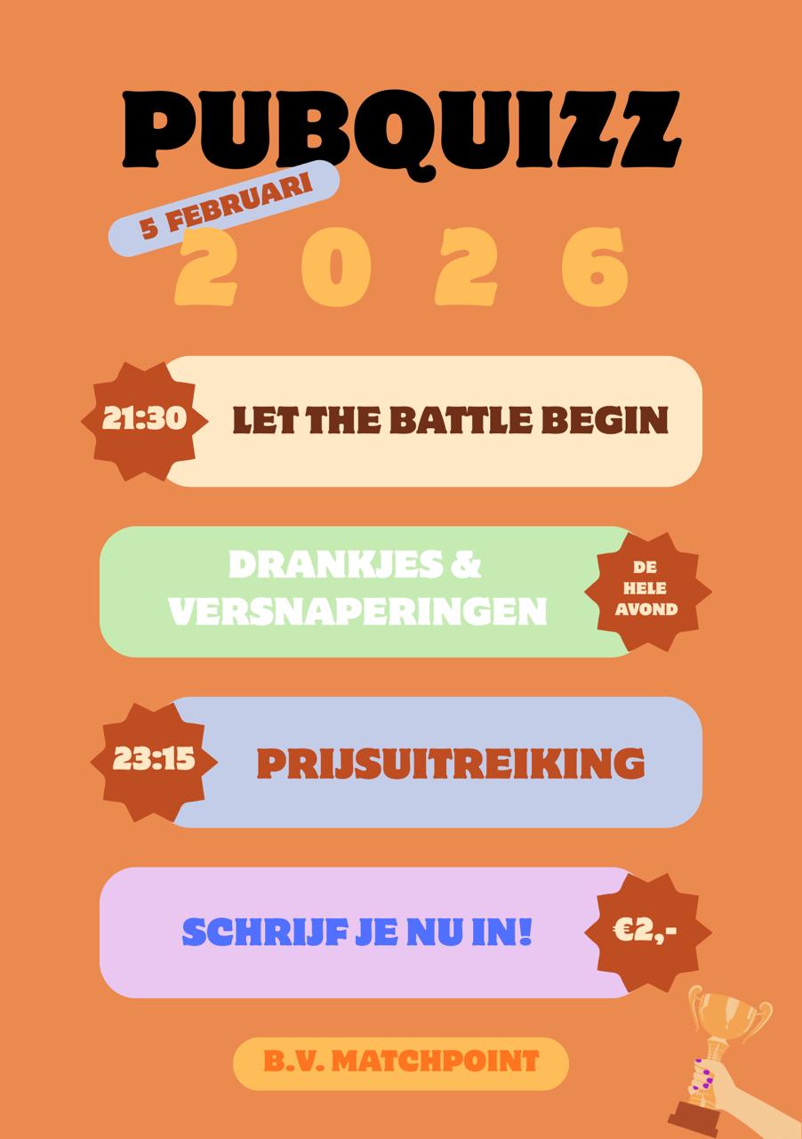 Pubquiz 2026 21:30 – 23:1505/02/2026 Sporthal De KoogWezelstraat 7Koog aan de Zaan, Bekijk locatieKaart Sporthal De Koog iCal Google Calendar Volledige kalender bekijken